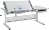 Компактный ящик с органайзером, который расположен под фиксированной частью столешницы, дает возможность хранить школьные предметы и мелкие канцтовары.