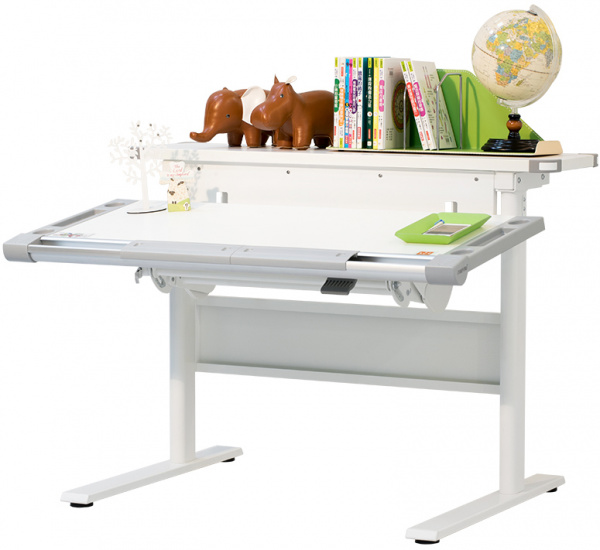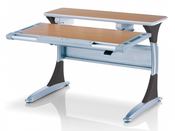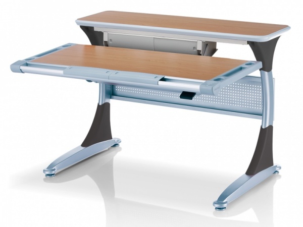 Основная столешница изменяет высоту относительно неподвижного основания парты с помощью специального надежного механизма. Этот механизм позволяет легко и быстро изменять высоту столешницы не только взрослому, но и ребенку. За этой партой можно заниматься даже стоя. А заднюю статичную часть можно использовать для размещения книг, установки держателей экрана компьютера или книжных полок.