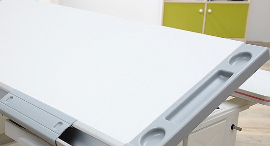 Встроенные пеналы особенно удобны для размещения канцелярии при наклоне столешницы. Передний пенал оборудован съемными линейками, которые также служат подставками под руки ребенка.