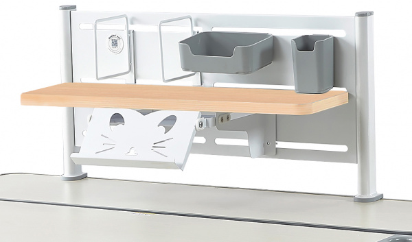 Также, полка дополнена пластиковыми пеналами для канцтоваров. Пеналы можно перемещать по металлической стенке полки.