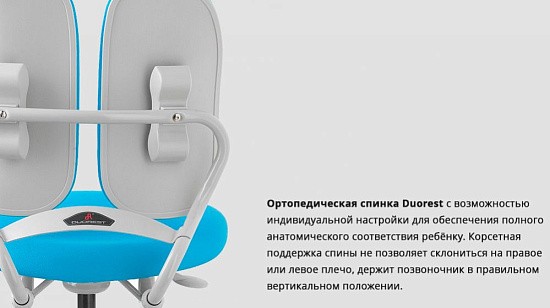 Детское ортопедическое кресло Duorest KIDS MAX L с наличием функции постоянной блокировки вращения по своей оси, ортопедической спинки и анатомического сиденья создано, чтобы сохранить здоровыми спинки подрастающего поколения и привить усидчивость, которую требуют в школе.
