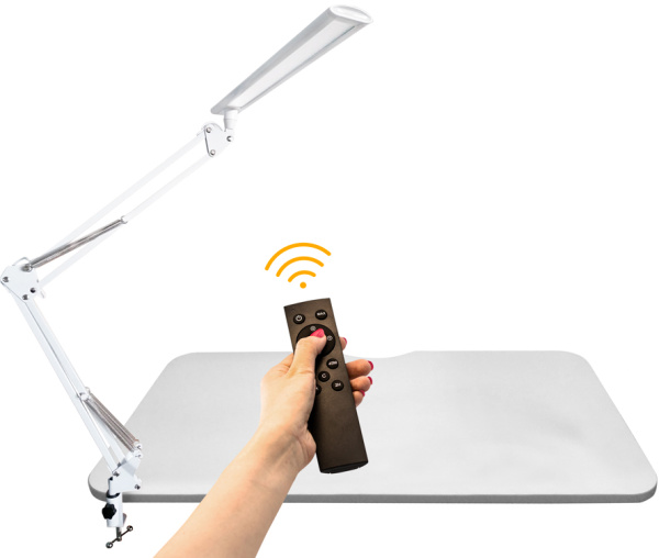 Корпус лампы изготовлен из прочного алюминия, а плафон - из усиленного пластика. Отличительной особенностью данной модели является наличие подвижного плафона, который крепится на подвижной перемычке корпуса, что позволит установить оптимальный угол освещения (до 180 градусов). Управлять лампой можно с помощью кнопки, установленной на шнуре питания. С помощью кнопки питания можно изменять яркость освещения лампы и изменять цветовую температуру. Для изменения цветовой температуры нужно нажать на кнопку, а для изменения яркости нажать и удержать. Лампа устанавливается на столешницы от 0 до 7 см и фиксируется с помощью струбцины.