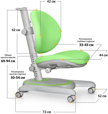 У кресла независимая регулировка высоты спинки и сиденья. Регулировка осуществяется с помощью специальных винтов на металлической несущей трубе Глубина сиденья регулируется ручкой -фиксатором. Кресло подойдет для детей от 3х лет до взрослого возраста