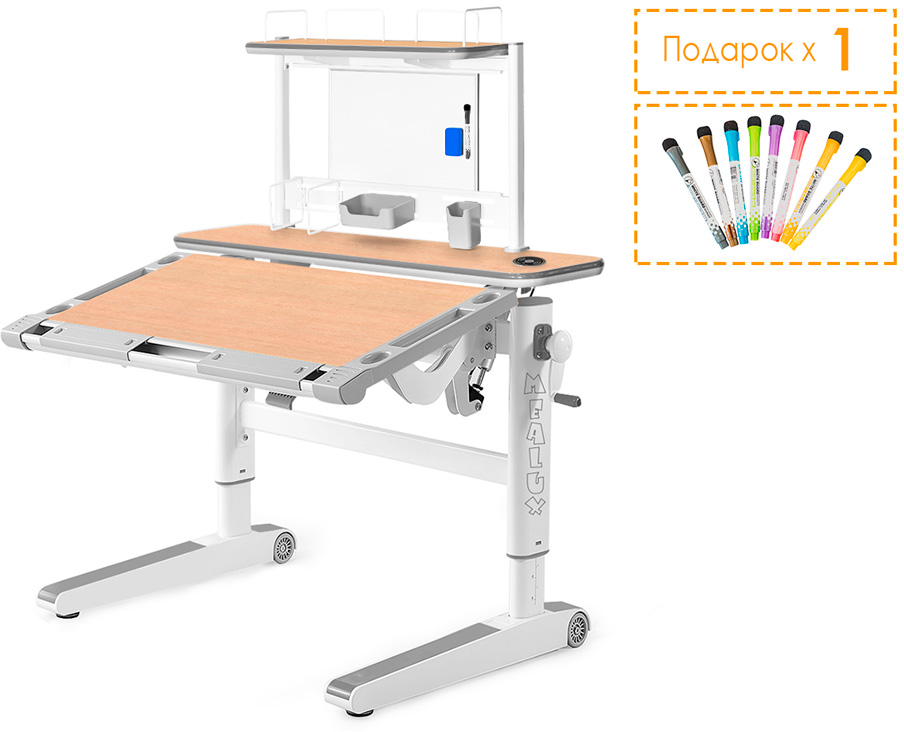 С помощью специальной ручки можно регулировать высоту рабочей части столешницы. Заданная высота устанавливается независимо от высоты всей конструкции стола.