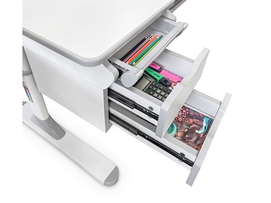 Под статичной частью столешницы размещены выдвижные ящики и пенал из прочных материалов для хранения канцелярских принадлежностей.