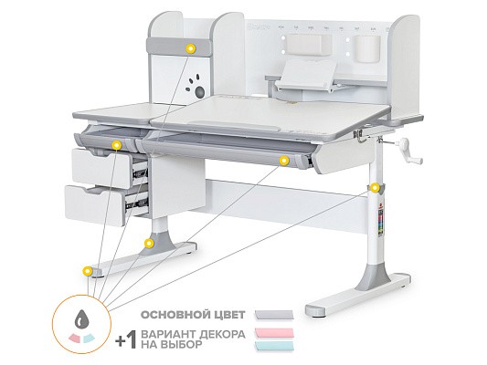 Одной из важных особенностей данной модели является наличие цветных накладок в подарок! Приобретайте полную комплектацию стола в сером цвете и получите розовые либо голубые накладки совершенно бесплатно! Накладки меняются на ножках, выдвижном органайзере и полке надстройке.