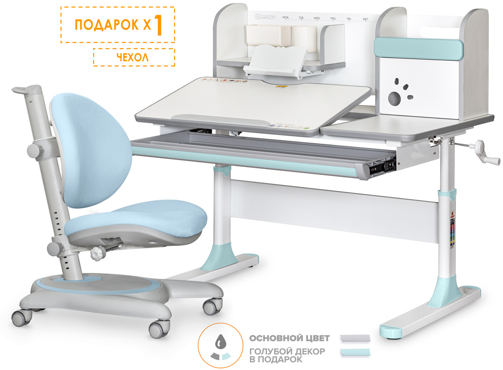Важной особенностью данного стола является наличие сменных цветных накладок. Приобретайте полную комплектацию стола в сером цвете и получите розовые либо голубые накладки совершенно бесплатно! Накладки меняются на ножках, выдвижном органайзере и полке надстройке. Меняйте цвет в зависимости от настроения!