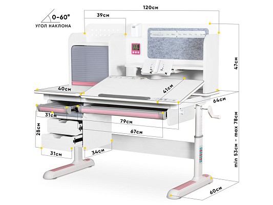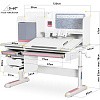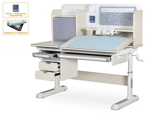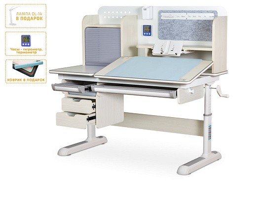 Подвижная часть столешницы легко изменяет угол наклона с помощью специального газлифта от 0 до 50 градусов. Благодаря такому большому диапазону регулировки стол можно использовать не только для чтения и письма, но и для рисования (как мольберт). Безопасный зазор гарантирует, что ребенок не прищемит пальцы, когда захочет самостоятельно изменить угол наклона.