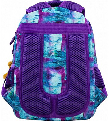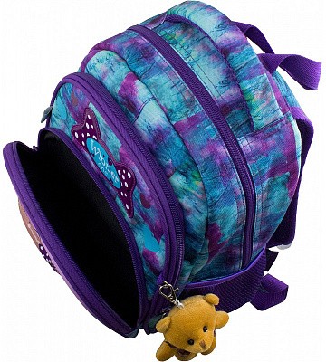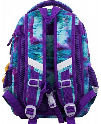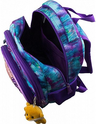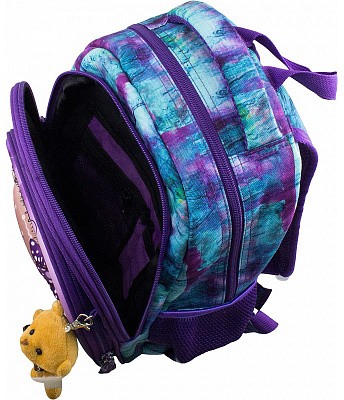 В школьном рюкзаке два основных отделения и карман-органайзер. Основное отделение с 2 двумя разделителями и резинкой для крепления школьных принадлежностей. Второе отделение без наполнения. Спереди вместительный карман на молнии украшенный объёмной 3D картинкой с органайзером для письменных принадлежностей. По бокам карманы-сеточки на резинке.