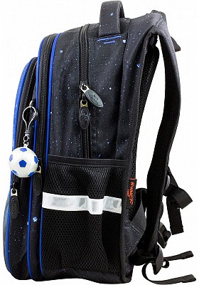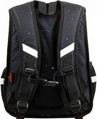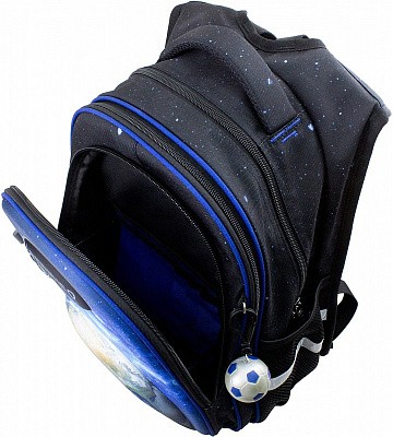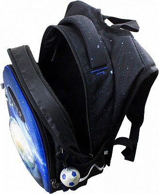В школьном рюкзаке два основных отделения и карман-органайзер. Основное отделение с 2 двумя разделителями и резинкой для крепления школьных принадлежностей. Второе отделение без наполнения. Спереди вместительный карман на молнии украшенный объёмной 3D картинкой с органайзером для письменных принадлежностей. По бокам карманы-сеточки на резинке.